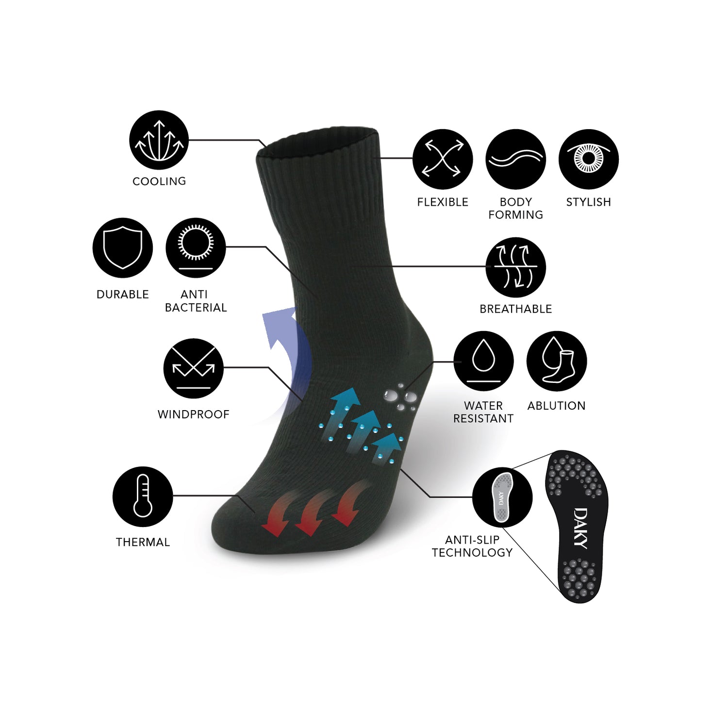 DAKY Socks incorporate our 3-layer technology allowing your feet to enjoy freedom of movement, yet are wind resistant and waterproof, while still being highly breathable. These socks will keep your feet dry and comfortable in any environment or weather condition. Perfect for Everyone Everyday with our performance socks which been approved for Masah and conform to all the requirements specified.